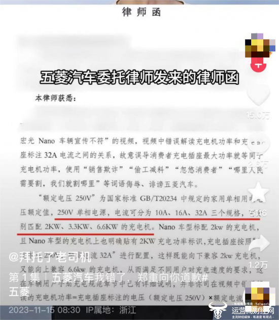 律师函中显示:视频中错误解读充电机功率和充电插座标注32A电流之间的关系,故意误导消费者充电插座最大功率就等同于充电机功率,使用“销售欺诈”“偷工减料”“忽悠消费者”“哪里有人民需要割,我们就割哪里”等词语侮辱、诽谤五菱汽车。