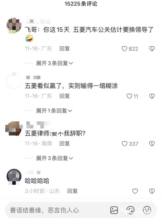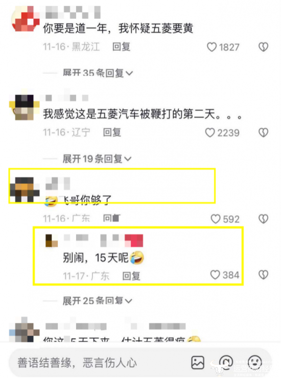 从视频评论区看,多数网友在情感上更倾向于主持人,都在“调侃”五菱汽车。比如“五菱看似赢了。实则输得一塌糊涂”“我感觉这是五菱汽车被鞭打的第二天”“你要是道一年,我怀疑五菱要黄”等。