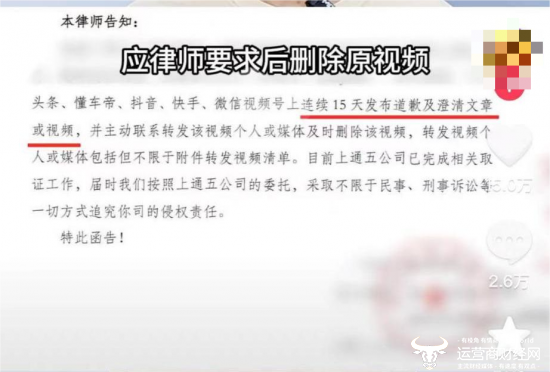 借于此,律师函中要求:在抖音、快手、微信视频号等多个平台连续15天发布道歉及澄清文章或视频。