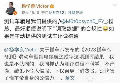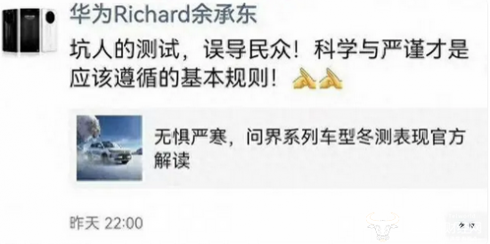 其中,疑似华为余承东在朋友圈表示:坑人的测试,误导民众;长城汽车官方发布《XXX冬测标准质疑沟通会》;吉利汽车集团副总裁杨学良表示:我同样认为测评过程不科学、不严谨,结论不令人信服。
