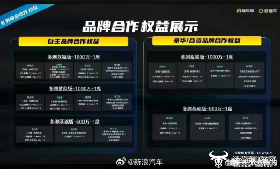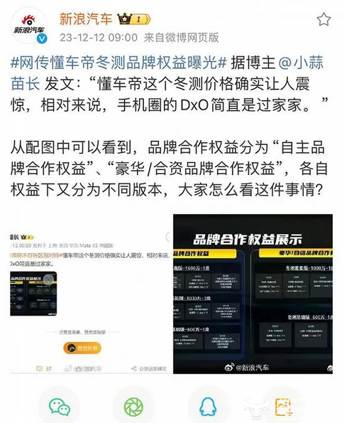 不过,运营商财经网注意到,新浪汽车曾带相关话题发文表示“XXX这个冬测价格确实让人震惊”。配图是印有“冬测商业合作档位”字样的图片,内容显示冬测驾趣版达一席1600万元。难道这次测评有商业行为?