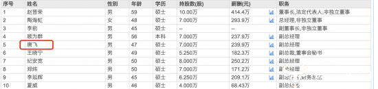在公司的高管中,除了董事长赵晋荣的414.4万和总经理淘海虹的293.9万外,在副总中唐飞的薪酬是最高的,达到了239.9万,其次是顾为群的237.9万,只比唐飞低了两万,而其他副总的薪酬都明显低于他们两位。