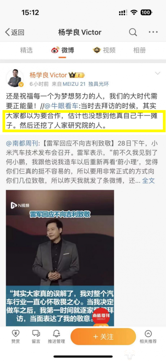 网友的诸多猜测并非毫无依据。杨学良曾转发一个汽车博主的动态,内容显示:其实大家都以为要合作,估计也没想到他真自己干一摊子。然后还挖了人家研究院的人。