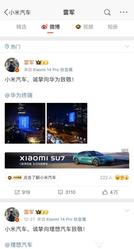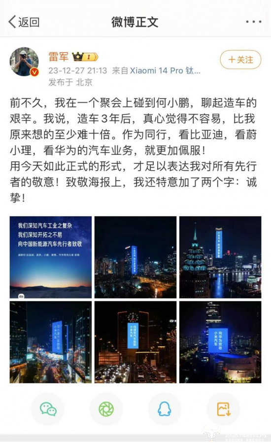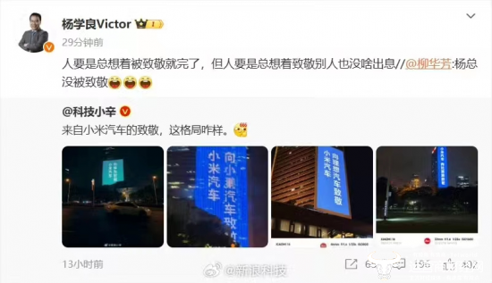 据了解,小米汽车创始人雷军通过个人社媒账号连发6条动态,并配上小米汽车向某某致敬的地标大屏广告牌图片,分别向比亚迪、蔚来汽车、小鹏汽车、理想汽车和华为致敬。
