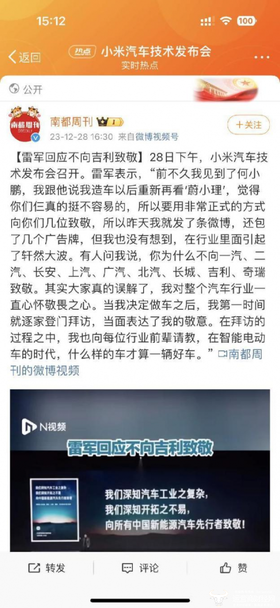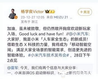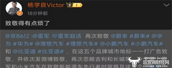 日前,小米汽车创始人雷军发布动态向一众新能源汽车品牌致敬引起广大网友热议,而此举同样引来吉利控股集团高级副总裁杨学良的注意,在社媒平台公开回怼。究竟是什么情况呢?