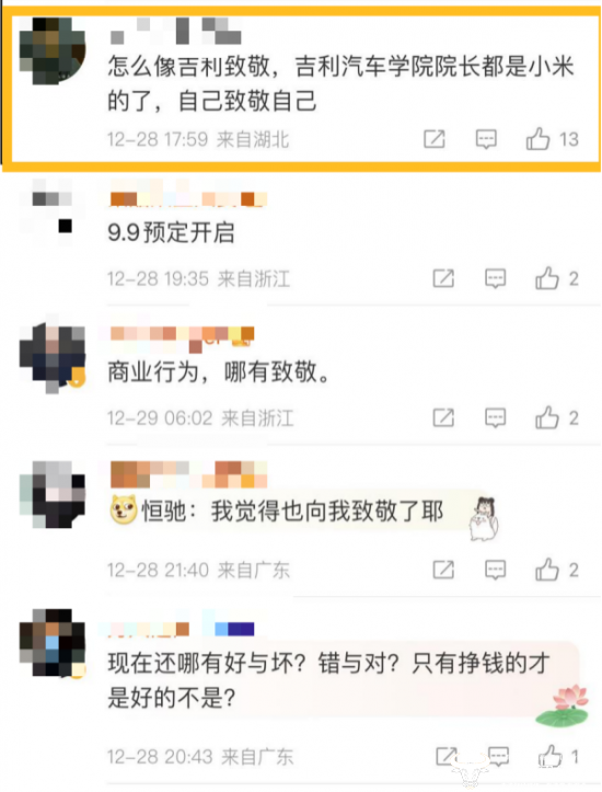 吉利控股集团高级副总裁杨学良也在个人社媒账号发言称:加油,虽未被致敬,但仍然敞开胸扉欢迎新玩家入场。表现得颇具格局和气度。