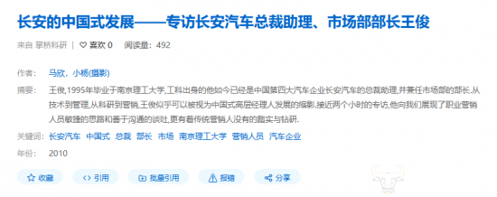 今年7月,长安汽车发布公告表示,聘任王俊为总裁。仅过去五个月左右,王俊就再被委任为深蓝汽车董事长,可见其颇受重用。