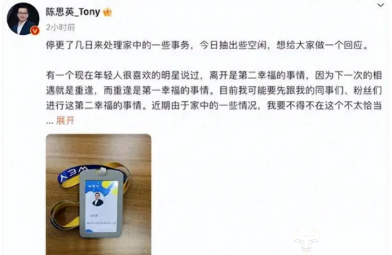 陈思英在个人社媒平台发文表示,从长城汽车离职是家庭原因。