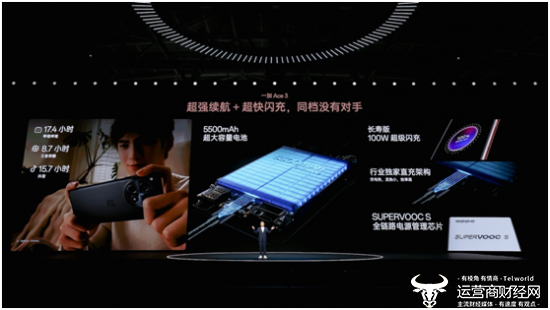 一加 Ace 3 搭载 5500mAh 大电池,配备 SUPERVOOC S 全链路电源管理芯片,支持核心器件功耗优化与软件算法功耗优化,电池放电效率提升到几乎没有损耗的 99.5%,同样性能表现下,可实现更低的功耗和更少的放电损耗。