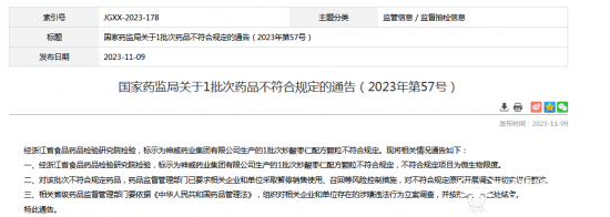 11月9日,国家药监局发布一则关于1批次药品不符合规定的通告(2023年第57号),内容显示,经浙江省食品药品检验研究院检测,标识生产企业为神威药业集团有限公司生产的炒酸枣仁配方颗粒不符合规定。