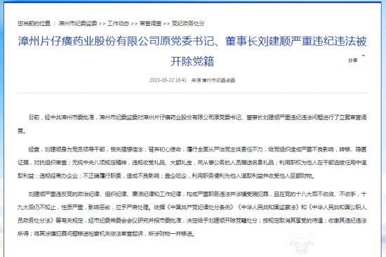 近期,运营商财经网通过梳理整合推出了“2023知名医药企业高管被查榜”,片仔癀及旗下公司有五位高管人员登榜,片仔癀的原董事长刘建顺就被查了。刘建顺在片仔癀的任期是什么呢?他是何时被查的呢?