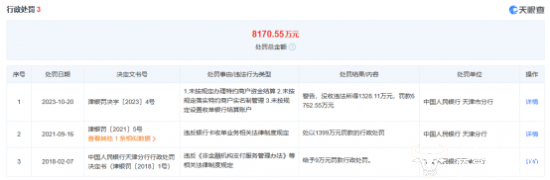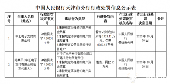 中国人民银行天津市分行行政处罚信息表显示,2023年10月20日,中汇支付因存在未按规定办理特约商户资金结算、未按规定落实特约商户实名制管理、未按规定设置收单银行结算账户三项违法行为,被人民银行天津分行进行警告,并没收违法所得1328.11万元,罚款6762.55万元。另外,中汇支付法定代表人陈某平因对上述前两项违法行为负有责任,被人民银行天津分行警告并罚款55万元。