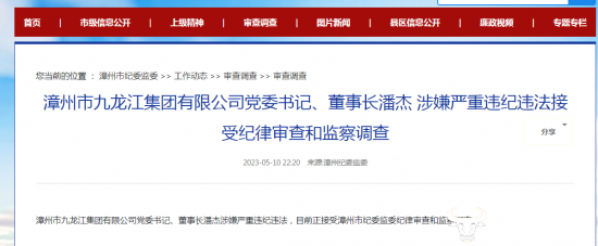 2023年5月10日晚,漳州市纪委监委官方网站披露一则消息,漳州市九龙江集团有限公司党委书记、董事长潘杰涉嫌严重违纪违法,目前正在接受漳州市纪委监委纪律审查和监 察调查。
