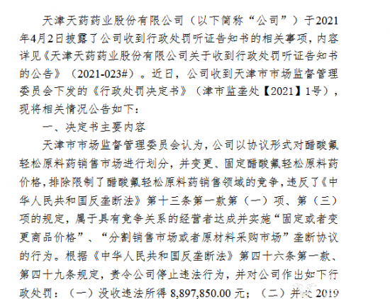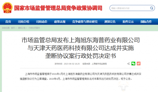 2023年6月2日,国家市场监督管理总局发布一则关于上海旭东海普药业与天津天药达成并实施垄断协议案行政处罚决定书的通告。根据行政处罚决定书沪市监反垄处〔2023〕3220190101519 号,天津天药与上海旭东海普在销售氟尿嘧啶注射液过程中涉嫌达成并实施了垄断协议,违反了《反垄断法》。因此,相关部门对天津天药处以2020年中国境内销售额3%的罚款,计约2988万元,并责令其停止违法行为。