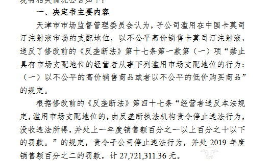 值得一提的是,这并不是津药药业近些年第一次因市场垄断被罚。在上述事项出现不久前,津药药业的子公司金鑫药业还因滥用在中国卡莫司汀注射液市场的支配地位,以不公平高价销售卡莫司汀注射液,被罚2772万元。