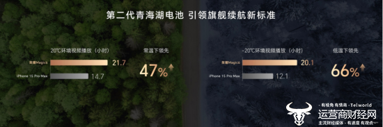 荣耀Magic6系列搭载全新升级的第二代青海湖电池,内置了全新的自研能效增强芯片HONOR E1,配合荣耀都江堰电源管理系统,通过软硬结合,实现了智慧充放和低温增强,为消费者带来全场景全天候长续航体验 。