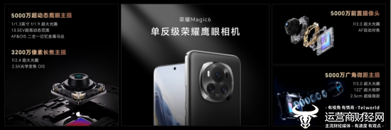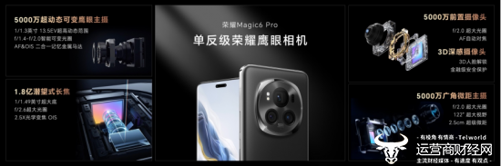荣耀Magic6系列全面采用定制5000万像素的超动态鹰眼主摄,可以感知明暗,无惧逆光拍摄,带来媲美单反的抓拍体验,定义旗舰抓拍新标准;其中荣耀Magic6 Pro更是采用目前业界领先F1.4超大可变光圈,支持F1.4-F2.0智能可变光圈;同时配备1/1.49英寸业界领先大底长焦传感器、1.8亿像素的潜望长焦,轻松聚焦更多光线,达成更为清晰的影像拍摄。荣耀Magic6Pro超强的单反级荣耀鹰眼相机,实现了更进一步的全焦段鹰眼抓拍,给你单反级质感人像、单反级运动抓拍、单反级风光摄影以及单反级十八箭星芒,满足更多场景下轻松记录精彩瞬间的需求。