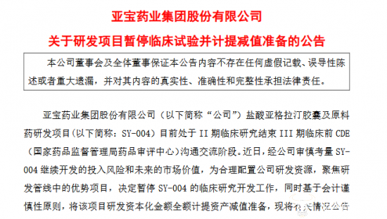 值得一提的是,前不久,亚宝药业在1月3日发布一则关于研发项目暂停临床试验并计提减值准备的公告,引发业界议论。