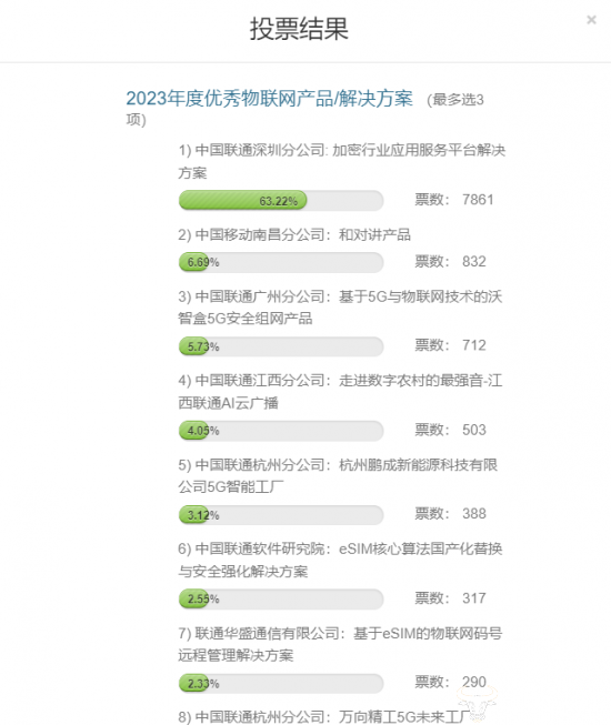紧跟其后的是江西联通的“走进数字农村的最强音-江西联通AI云广播”、杭州联通的“杭州鹏成新能源科技有限公司5G智能工厂”、和联通软研院的“eSIM核心算法国产化替换与安全强化解决方案”,各票数之间的差距较为微弱。