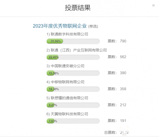 截至1月11日下午6点,运营商财经网曝光了“2023年度优秀物联网企业”相关投票情况,其中,联通数科暂时排名第一,联通(江西)产业互联网有限公司、安徽联通、中移物联网有限公司紧随其后,且票数之间差距不大。