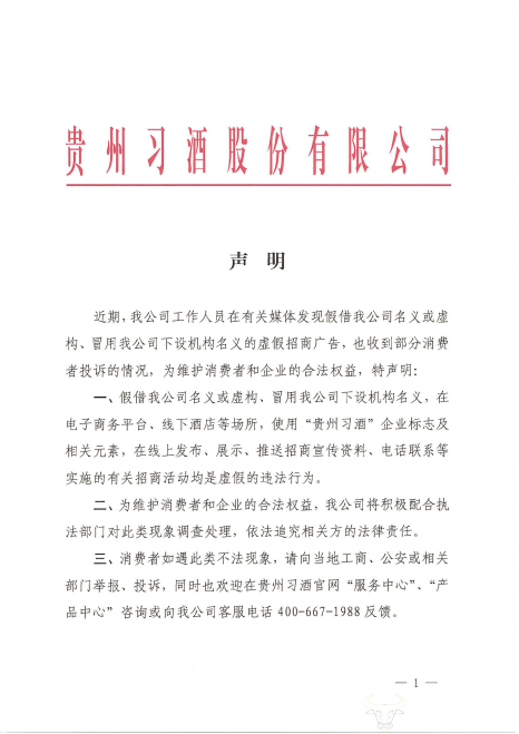 近期,贵州习酒发布声明称,公司工作人员在相关媒体发现了有假借公司名义或虚构、冒用公司下设机构名义的虚假招商广告。对此,公司表示将积极配合执法部门对此类现象调查处理、依法追究相关方的法律责任。