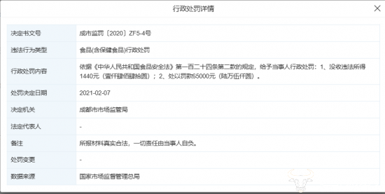此外,成都海霸王公司还曾在2021年2月7日,因食品(含保健食品)行政处罚,除了被没收违法所得1440元外,成都市市场监管局还对该公司罚款了6.5万元。