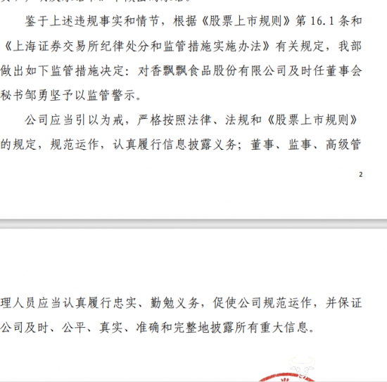 上述行为违反了股票上市规则,因此上交所监管部对香飘飘食品股份有限公司及时任董事会秘书邹勇坚予以监管警示。
