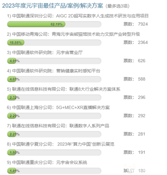 此外,联通在线打造的“联通8大行业解决方案体系”、上海联通打造的“G+MEC+XR直播解决方案”、联通在线的“联通数字人系列产品”紧随其后,三者之间票数差距不大。宁夏联通的“2023年‘算力中国’创新云展览”、重庆联通的“元宇宙会议系统”暂列第八、第九位。