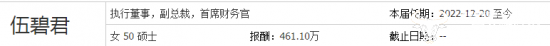 据同花顺财经网站显示,伍碧君2022年的薪酬为461.1万元。