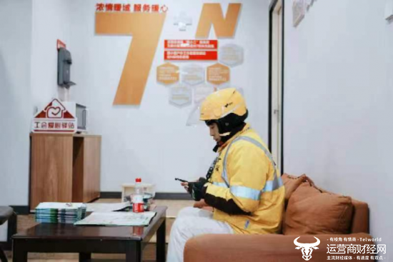 (外卖骑手在“阳小驿”户外工作者驿站休息)
