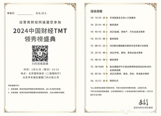 与往年一样,盛会的举办时间一般确定在新年伊始、农历新年之前,而今年的2024中国财经TMT领秀榜盛典将于1月21日(周日),即农历腊月十一正式召开。距离目前,还仅剩5天时间。
