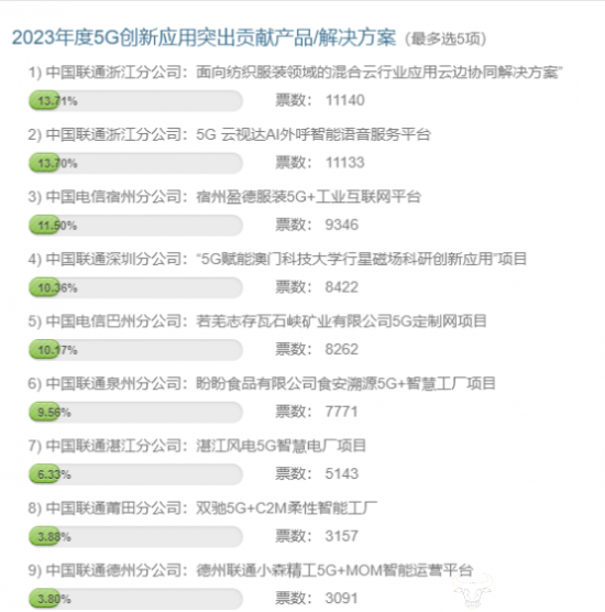 截至2024年1月16日下午6时,浙江联通打造的“面向纺织服装领域的混合云行业应用云边协同解决方案”与“5G 云视达AI外呼智能语音服务平台”分别暂列第一、第二位,两者之间票数差距不大。紧随其后的是宿州电信打造的“宿州盈德服装5G+工业互联网平台”、深圳联通打造的“5G赋能澳门科技大学行星磁场科研创新应用”项目、巴州电信打造的“若羌志存瓦石峡矿业有限公司5G定制网项目”、泉州联通打造的“盼盼食品有限公司食安溯源5G+智慧工厂项目”,他们之间票数追的很紧。