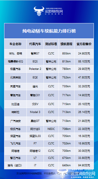 榜单中续航里程数最高的是智界S7,在CLTC工况下,其续航里程最高可达855km。在同样的测试标准下,高于岚图追光、特斯拉Model 3、阿维塔12、智己L7和宝马i7等一种车型。但是,智界S7官方起售价却比这些车型都要低,为24.98万元。