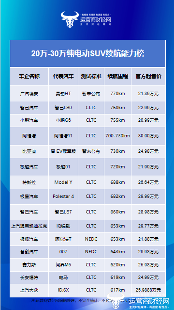 近日,运营商财经网整理了各车企品牌推出的“20万-30万纯电动SUV”,并按照续航能力为该区间车型进行了排行。在价格差不多的情况下,哪款车型的续航能力强?运营商财经网试图揭秘。