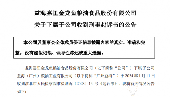 近期,金龙鱼发布公告称,子公司广州益海收到淮北市人民检察院淮检刑诉〔2023〕16 号《起诉书》,此事引发关注。
