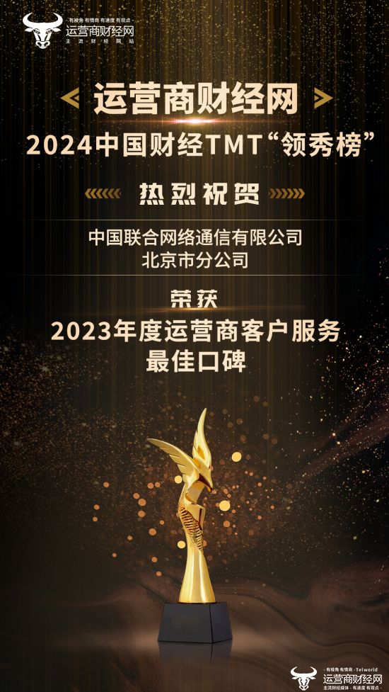 运营商财经网对获奖者颁发了荣誉证书,其中,中国联合网络通信有限公司北京市分公司在“群雄角逐”中脱颖而出,荣获“2023年度运营商客户服务最 佳口碑”奖项。