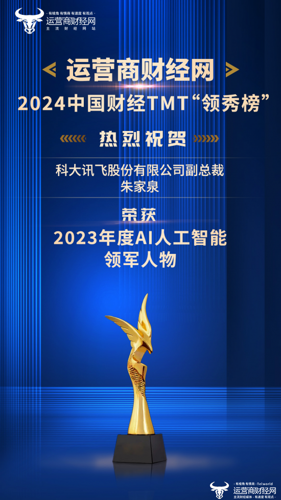 活动现场,运营商财经网正式公布了获奖的名单,科大讯飞副总裁朱家泉荣获“2023年度AI人工智能领军人物”。