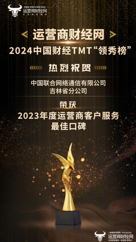 中国联合网络通信有限公司吉林省分公司荣获“2023年度运营商客户服务最 佳口碑”。