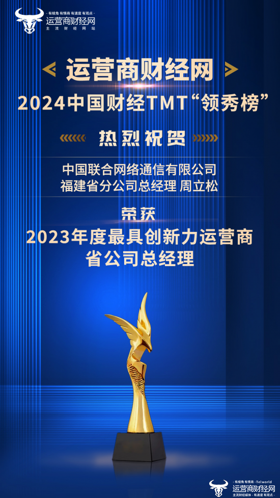祝贺福建联通总经理周立松荣获“2023年度最具创新力运营商省公司总经理”奖项。