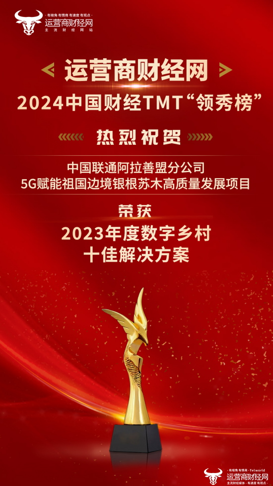 盛典上,运营商财经网正式公布了获奖企业的名单。其中,中国联通阿拉善盟分公司的“5G赋能祖国边境银根苏木高质量发展项目”荣获“2023年度数字乡村十佳解决方案”奖项!