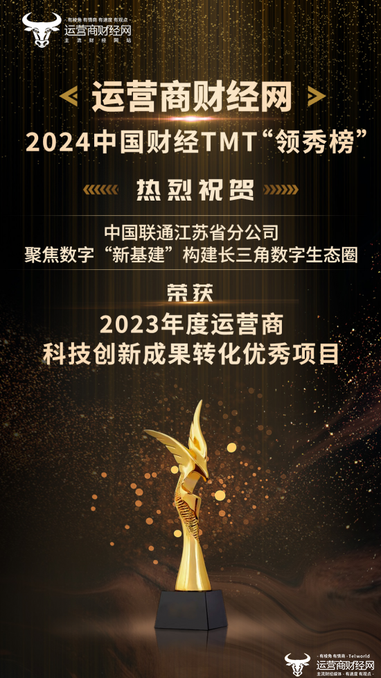 1月21日,由国内知名主流财经、科技资讯平台——运营商财经网主办的2024中国财经TMT“领秀榜”盛典通过线下会议及线上直播方式正式召开。盛典期间,运营商财经网对年度评选的获奖名单进行了揭晓,值得注意的是,江苏联通凭借——聚焦数字“新基建”构建长三角数字生态圈这一优秀项目荣获“2023年度运营商科技创新成果转化优秀项目”大奖。