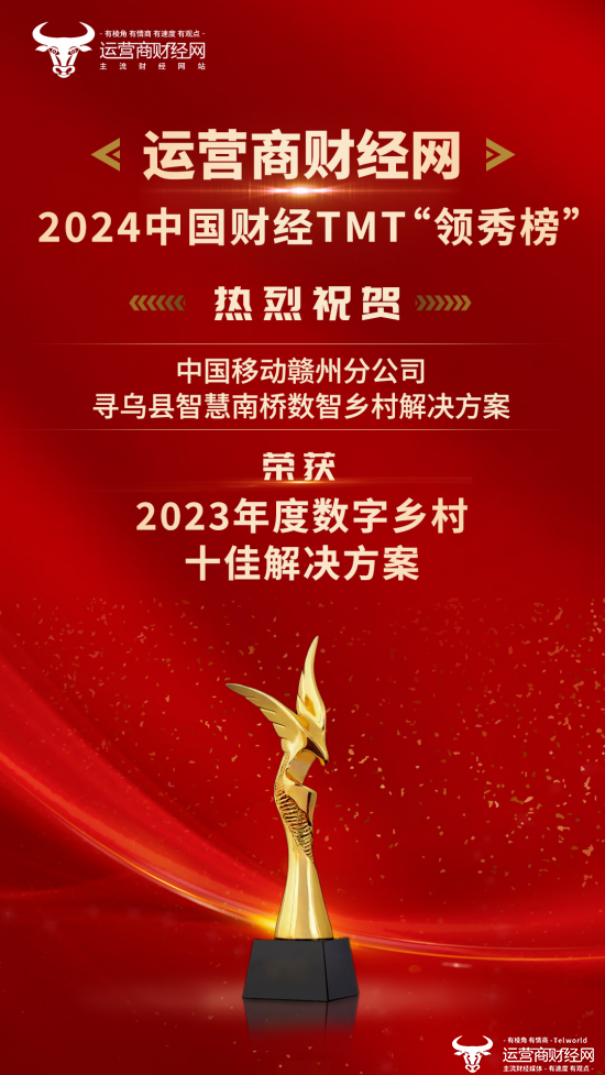 1月21日,在运营商财经网主办的2024中国财经TMT“领秀榜”盛典上,中国移动赣州分公司的“寻乌县智慧南桥数智乡村解决方案”被评选为“2023年度数字乡村十佳解决方案”!