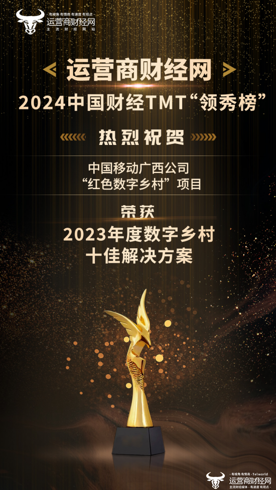 盛典现场,运营商财经网正式公布了获奖企业的名单。其中,中国移动广西公司“红色数字乡村”项目荣膺“2023年度数字乡村十佳解决方案”奖项。