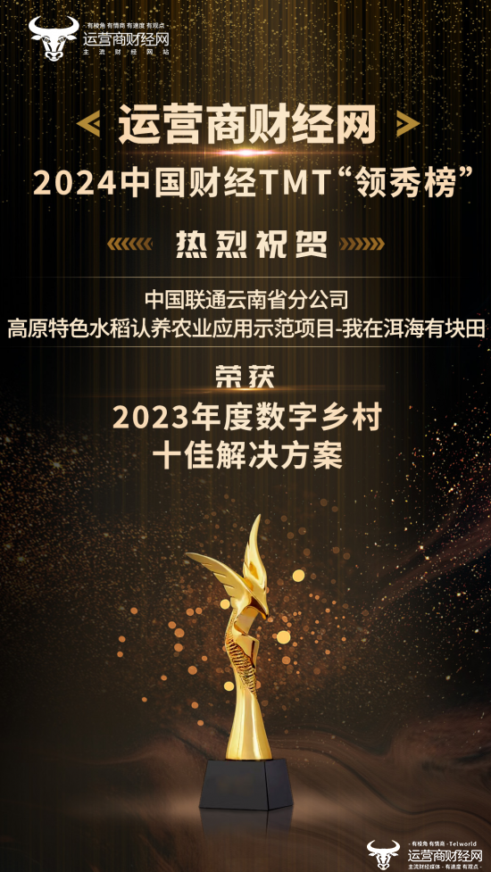1月21日,在运营商财经网主办的2024中国财经TMT“领秀榜”盛典上,中国联通云南省分公司的“高原特色水稻认养农业应用示范项目-我在洱海有块田”荣获“2023年度数字乡村十佳解决方案”奖项,对此我们表示真诚地祝贺。