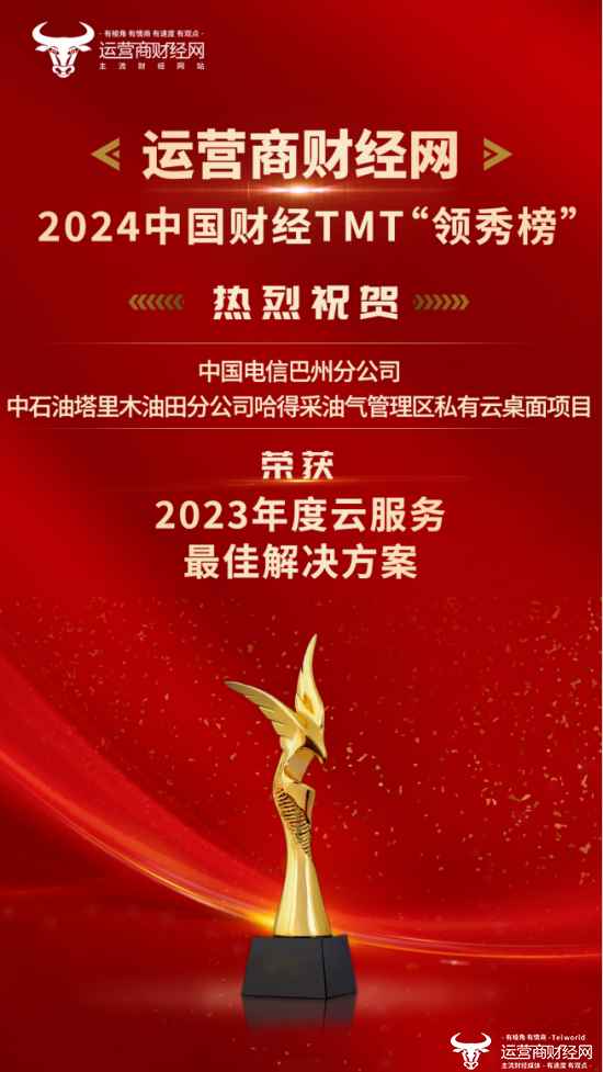 巴州电信“中石油塔里木油田分公司哈得采油气管理区私有云桌面项目”喜获“2023年度云服务最 佳解决方案”。