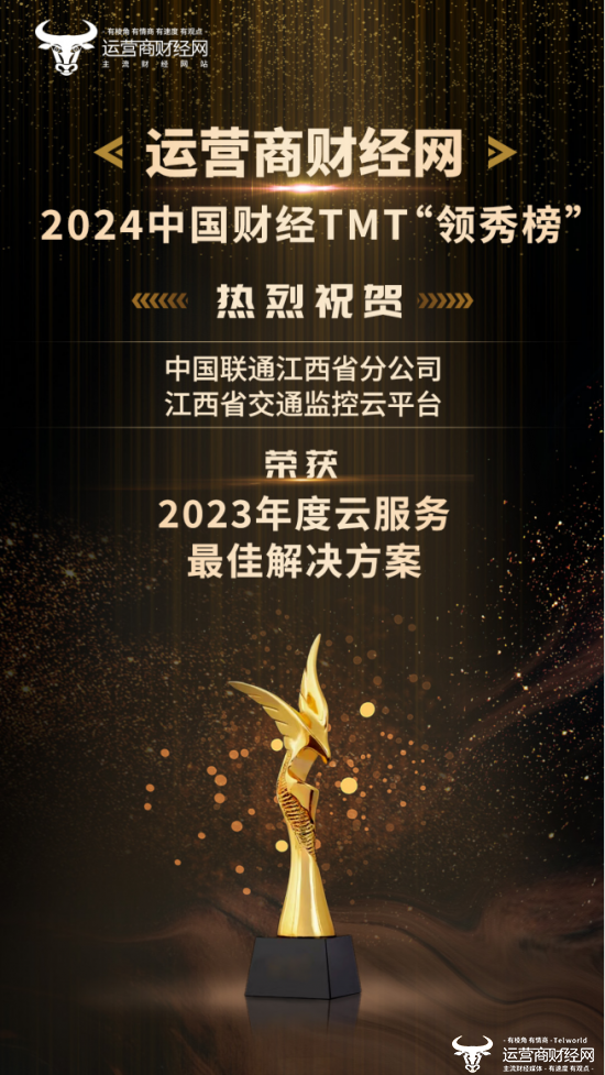 会议现场,2024中国财经TMT“领秀榜”公布:江西联通“江西省交通监控云平台”荣获“2023年度云服务最 佳解决方案”。