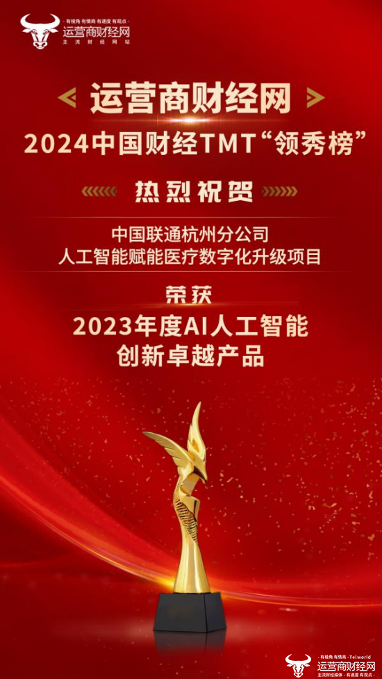 在颁奖盛典上,中国联通杭州分公司的人工智能赋能医疗数字化升级项目荣获“2023年度AI人工智能创新卓越产品”奖项!