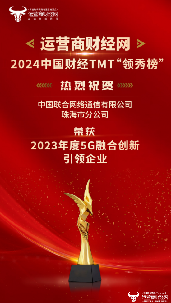 珠海联通荣获“2023年度5G融合创新引领企业”荣誉奖项。