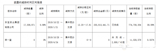 值得一提的是,东宝集团还曾在某段时间内大手笔减持套现。在2019年10月22日至2020年1月21日期间,东宝集团通过集中竞价的方式,以减持价格区间12.25—17.81元/股的价格减持了约1754万股,按照减持均价的来计算,大致套现2.6亿多。