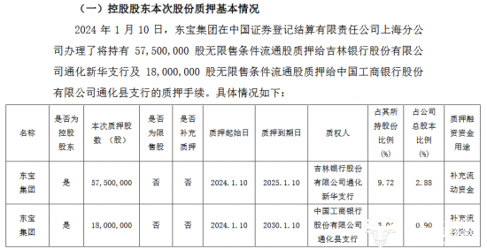 根据通化东宝发布的公告显示,东宝集团质押融资资金的用途为补充流动资金,此次分别向吉林银行股份有限公司新华支行质押5750万股,向中国工商银行股份有限公司通化县支行质押1800万股。